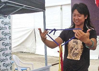 23日,在啤酒城商品展示摊位前,来自烟台的小伙郝龙正在表演魔术,吸引了众多游客的围观。记者也凑热闹,看到这个摊位前摆满了各式各样的魔术玩具,在摊位一侧还贴着刘谦的宣传画。“刘谦春晚表演的橡皮筋,我也会!”说着,郝龙就从摊位上捡起两根橡皮筋表演起来。