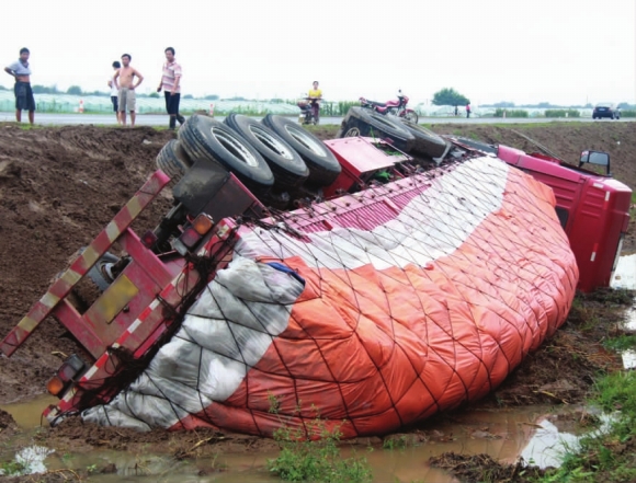 本报8月23日热线消息 (文/片 记者 张焜吴凡)23日凌晨,一辆拉着40吨白糖的货车行至宝通街青州谭坊路段时,对面突然出现了并排而行的三辆大货车。突如其来的情况把司机吓了一跳,一惊之下,他开着装满白糖的车子就“飞”进了路边边沟。