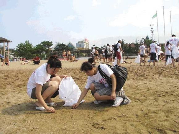 23日,1180名交运集团志愿者顶着烈日清理浴场沙滩的垃圾,包括石块、烟头、塑料袋等,他们还主动将垃圾袋赠送给