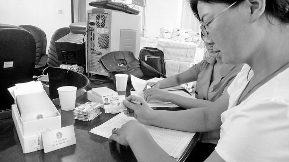 23日,记者来到泰山区职工和居民社会保障卡发放点———泰山区社会保险事业管理局办公室。虽然已临近中午12点,但发卡办公室里仍然有工作人员和社区代表正在忙碌地核对参保居民的个人信息。