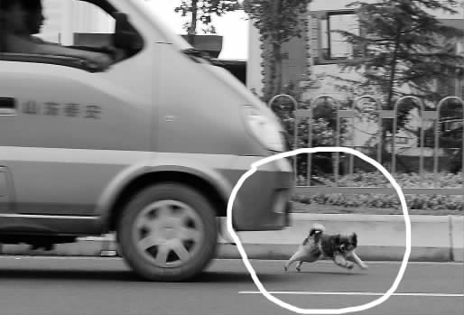 道上,小狗左顾右盼,试图过马路,被一辆快速行驶的