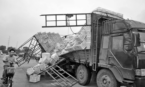23日,记者在泰城泰玻路口看到,一辆核载10吨的大货车停靠在路边,遮雨的篷布与绳索散落在车左边,高3米左右的右部车厢护栏从中段向外撕开,原本处于该位置的整扇车厢门被几十筐黄桃压在了路面上。靠近人行道的路面上,码放着两大堆黄桃,记者粗略统计,约400筐。司机却正在驾驶室内酣睡。路过的行人开玩笑说:“是不是要在这里卖桃子啊?”人行道上,车主周先生对记者说:“都是下雨惹的祸,要不是雨天路滑转弯时不敢急刹车,就不会出这事了。”原来,这辆大货车载了15吨临沂出产的黄桃,用塑料筐装盛,每筐40斤,经泰城取道肥城,运往单县。23日凌晨1点多,行驶到泰城泰玻路口转盘时,因路面湿滑司机不敢过度刹车减速,近3米高且湿滑的塑料筐在离心力作用下向右甩去,车厢右侧中段车门处被挤破,黄桃散落一地。