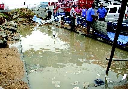 10时许,记者赶到现场,一个深约2米的大坑内蓄满水,水仍缓慢涌出。周边商户正清理灌人屋内的水和泥沙。