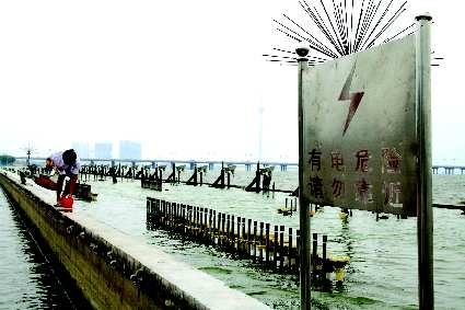 23日下午,在沂河岸边的喷泉水池旁边,—位年轻男子无视水池旁边的提醒牌,在水池边捕鱼,非常危险。记者徐升摄