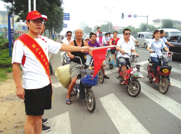22日,临沂第二十三中学的志愿者在协助交警指挥行人过马路。暑假期间,罗庄区教育局联合罗庄团区委招募200余名青年教师担任社会志愿者,在各路段设立了50余个文明监督岗、爱心助学岗、交通协管岗。通讯员 许金刚记者丽丽摄