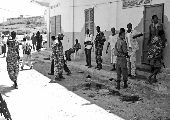 图①:24日,政府军在索马里摩加迪沙政府控制区内遭到爆炸袭击的一家酒店外巡逻。