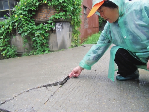 顺着小区一路往东,在小区主干道的一个上坡处记者看到,路面已经隆起,两块路面上下错开了两指宽的缝,缝隙旁边有很多长短不一的白色划痕。“这就是车开过这个路面后,高的这一块划底盘留下的痕迹。”在金山小区做了4年环卫工的部淑华说。