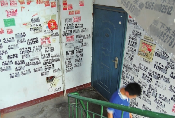 24日,御碑楼社区南区居民楼道内的白墙壁,密密麻麻地写满了“疏通下水道”、“搬家公司”、“办证”的电话,楼道俨然变成了“广告墙”,令居民感到十分厌烦。
