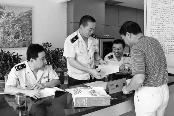 为给纳税人提供优质服务,泰山地税分局完善了查询机、评价器、叫号机、双显屏等服务硬件,而且实行大厅主任轮值。图为纪检书记正在大厅内值日接访。