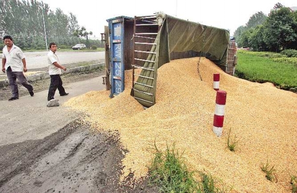 23日下午,记者在327国道高新区路段看到,一辆三轮车在路边侧翻,车底下是一大片黄澄澄的玉米粒。记者采访得知,这辆农用三轮车自东向西行驶,由于躲避大货车拐弯过急侧翻到路边,所幸没有人员伤亡。本报记者 张晓科摄