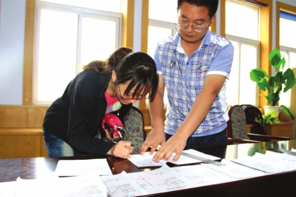 24日上午,在金雀山中心小学,一学生家长正替孩子领取入学通知书。据了解,市区各小学开始陆续发放入学通知书。 记者徐升刘遥摄
