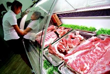 24日,在中丘路上—家冷鲜肉店里,工作人员在整理黑猪肉。据该店工作人员介绍,黑猪肉价格—般在120元/公斤左右,其中精瘦肉240元/公斤,里脊肉300元/公斤,虽然价格较高,但销量很好,每天能销售100多公斤。