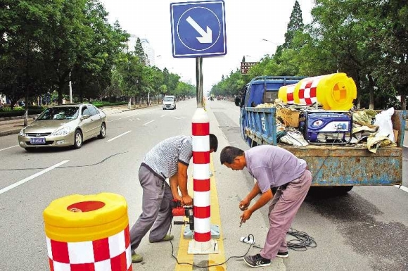 8月24日,德州东方红路上施工人员正在安装交通指示牌,这也标志着近期交警部门对市区主要道路更换的隔离护栏及其配套设施即将完工。
