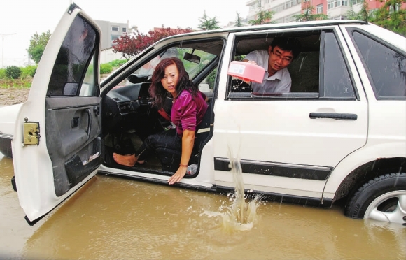 24日,一辆轿车在泰玻大街东段与龙潭路交叉口300多平方米的积水区内趴窝。车里的人用塑料盒