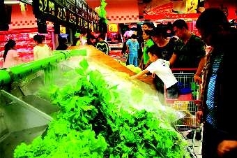 25日下午,在人民广场一地下超市蔬菜区,市民正在选购蔬菜。据销售人员介绍,连日的降雨影响了蔬菜运输,增加了运输成本,促使菜价上涨。