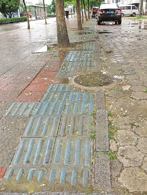 在开发区珠江路路段的盲道,每隔差不多三米就有行道树种在盲道上,每棵行道树都占用了一大半盲道,井盖也是十几米就有一个,占用盲道且不说,还高出盲道五六厘米,盲人走过时很容易被绊倒。而且盲道道板铺设不规则,有的地方多一块,有的地方缺一块,不是规则地铺设道板,盲人用盲棍不容易正确地识别路况,容易引起误导。记者还发现,在路口处也没有点状的指示道板,盲人不能根据指示了解到已经走到路口处,需要准备过马路。