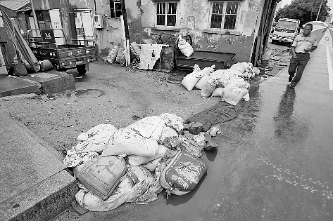 居民们在小新街胡同口用沙袋堵路防雨。 赵金阳 摄