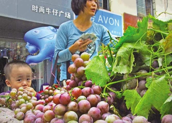 24日,一位小朋友在品尝新鲜上市的葡萄。据黄河涯种植葡萄的孙师傅介绍,由于节气原因,加上近期的雨水影响,当地葡萄今年晚上市了近半个月。