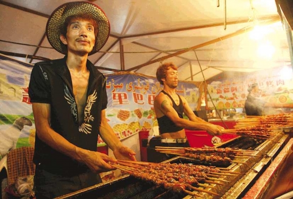 25日上午,在阿拉伯烤肉摊位前,小伙一边伴随着乐声跳着舞,一边烤着一排大肉串,不少游客围过来掏钱尝鲜。“我们的烤肉具有阿拉伯风味,原料比较特别,已经来这五六年了。”阿拉伯烤肉的老板告诉记者,他们的烤肉具有阿拉伯烤肉风味,现在已经将阿拉伯烤肉注册为商标了。