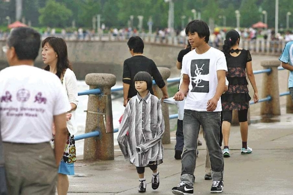 25日,在五四广场,一名儿童穿着家里人的衬衣。近日青岛降水较多,气温明显下降。记者从青岛市气象台获悉,岛城未来三天持续有雨,分布不均匀,气温偏低,最低气温跌破20℃。29日,气温才稍有回升。