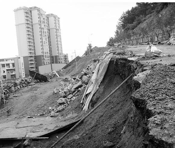 本报8月25日讯(记者张榕博)三个月前,位于市北区樱花小镇内“枕海山庄”南面的道路发生大面积塌方。25日,记者采访发现,该路段塌方不但至今仍未修复,连日大雨又冲刷浸泡出新的隐患。