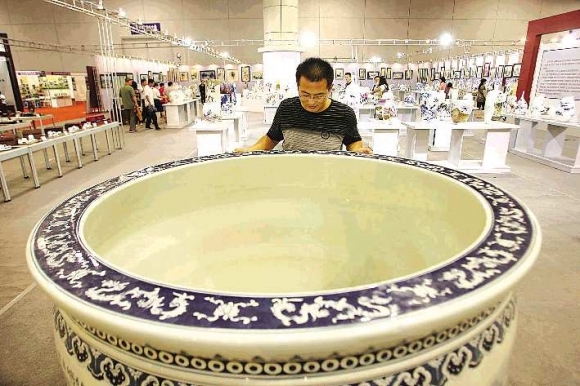 26日上午,第五届中国民间工艺品博览会在烟台国际博览中心隆重开幕,本届博览会规模盛大、阵容强大、大师云集、精品荟萃,不仅展位多,展品多,品种多,而且新品多,精品多,亮点多,1012个展位展出的国宝级艺术品让此次展会成为今年烟台最大规模的艺术展会。图为超大青花瓷作品吸引了不少人。 本报记者赵金阳 摄