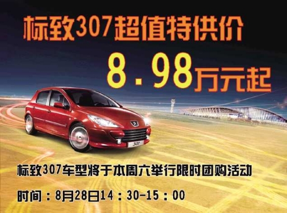 19台现车一台不留,真正享受团购的力量,只要您喜欢标致汽车,只要您想买车,我们以全国最优惠的价格给予保证,既让您享受到优惠的价格,又能享受到高品质的服务。东风标致倾情献礼,8月28日团购规模空前,同时签订价格保证协议为您保驾护航,让您在享受价格优惠的同时,更增添一份安心和惬意。