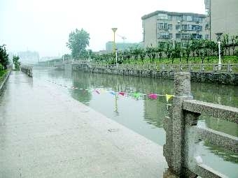 26日上午,记者在陷泥河与金雀山路交会处南北两侧,分别见到了被毁坏的护栏和流人河中的污水。北侧消失的护栏处,仅有一细绳系住,长达20米左右,地面处喷写有“水深危险,请勿靠近”字样。而距金雀山路南侧150米左右的陷泥河沿岸西侧,则有污水不停从花坛冒出来,漫过整个人行道路面,流人陷泥河中。经污水长期浸泡,花坛内有些植物已经死亡。