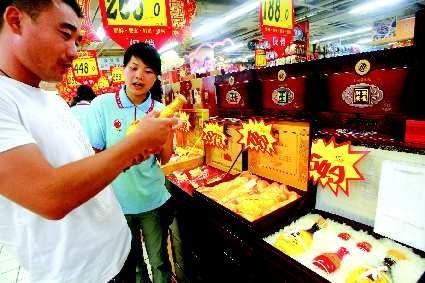 26日,在市区一家超市内,销售人员正向顾客推销白酒。距中秋还有二十多天时间,市区的各大商场超市纷纷将酒类摆到门口显眼位置,并纷纷打出买一赠一、赠送礼品等各种各样的促销活动,一场酒类促销战在各类品牌之间悄然打响。