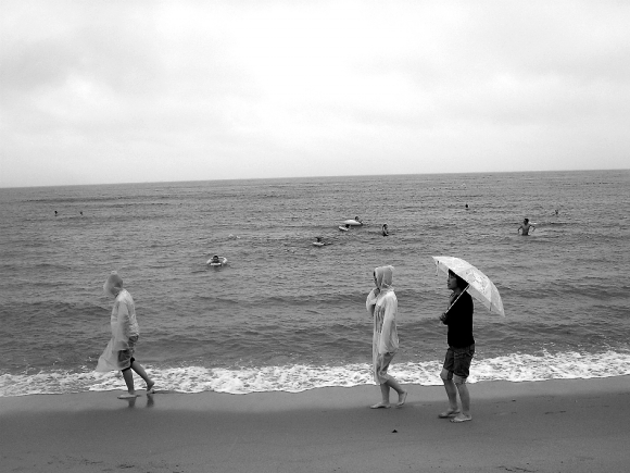 26日,威海全市普遍出现降雨。在海滨浴场内,很多游客冒雨在海中畅游。