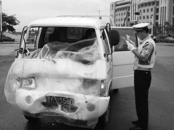 25日上午,威海的一辆小货车在烟台市牟平区出了车祸,车头严重变形,前挡风玻璃破碎,很多零件也是摇摇欲坠。经当地交警处理后,司机弄了张塑料布蒙在车头上,一路将车开回了威海市羊亭镇。交警四大队民警将车拦下后,对司机进行了批评教育,责令司机将车拖回维修。