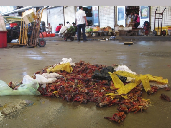 25日下午,记者来到南下河市场,发现只有两三家商户在销售小龙虾。“这两天的小龙虾卖的不如以前了”,德福水产的老板告诉记者,“以前平均每天能卖100多斤,今天只卖了40斤左右。由于不能及时卖出去,死了不少龙虾,所以我决定明天不进货了。”