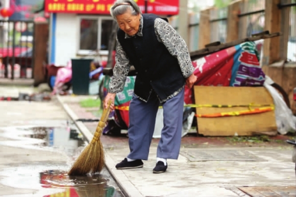 26日下午,记者来到苇湾小区见到王述云老人时,她正弯着腰仔细地打扫着楼前的道路。老人看起来也就80岁上下,一手提着扫帚,一手拎着簸箕,仔细地将混在雨水里的落叶清扫起来。看见有人经过,老人便会微笑着让开,脸上露出慈祥的微笑。“年轻人工作不容易,我有时间打扫下卫生,大家住着都舒服”,每逢从这里经过的居民向老人表示感谢时,腼腆的老人总会这样谦虚地说。