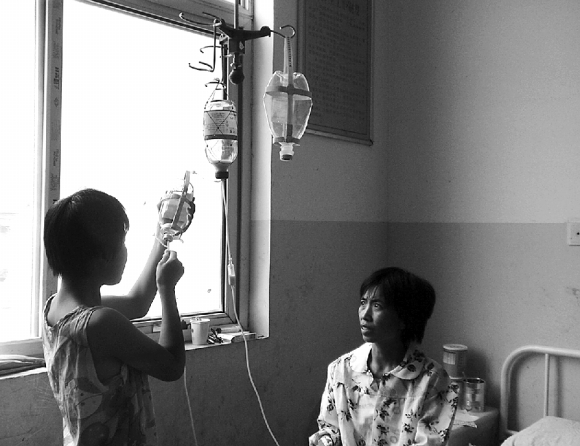 灵灵每天早上不到6点就起床。给母亲倒便盆、打水洗脸、换吊瓶,洗妈妈换下来的衣服。病房里没空调只有电扇,但因为妈妈不能吹风,天再热灵灵也不开电扇。看着灵灵满身的痱子,于桂芹难过得直掉泪。