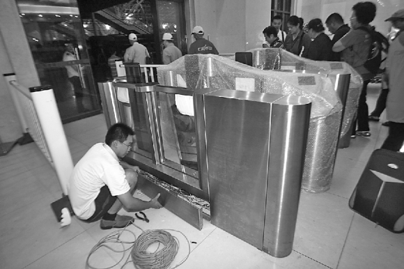 25日晚,在青岛火车站候车室,工作人员正在调试自动检票机。据了解,自动检票机投入使用后,持磁卡车票的旅客从自动检票机通道进站,将车票在感应闸机上轻轻一碰,闸口即打开。