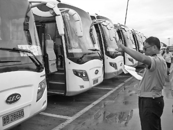 “开倒车灯、开雨刷、刹车……”26日下午2时许,记者在普宁路停车场看到,市南区众多校车正集中在一起,接受市南交警的全面“体检”。在此次的临检中,民警对车辆的制动系统、灯光、轮胎、座位、灭火器、安全带等各个方面,展开了一次详细的大检查,从而保护学生上下学路上的安全。