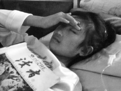 26日上午,当岱岳区大河学校初二学生于杨旸来到泰安市中心医院血液内科病房的时,12岁白血病女孩魏娜正躺在床上打点滴,一只手平放在床上,另一只手拿着一本《读者》,正在聚精会神地看着。当看到于杨旸来看她手里还拿着一些文学书籍时,魏娜笑着说,这下子可有书看了。据魏娜的主治医师、泰安市中心医院血液内科主任滕清良说,魏娜患的是再生障碍性贫血,主要是依靠药物辅助治疗,由于怕频繁输液在皮肤上扎的针孔过多,所以在她的胳膊上固定了一个输液管,打点滴的时候直接插管就行,一天的平均输液时间在10个小时左右。“输液的时候躺在床上不能乱动,也不能光睡觉,没事的时候我就看看书。昨天有几个好心的小伙伴给我带来了很多书,还没看完呢。”魏娜说着便用手揉揉眼睛。由于光线很暗,于杨旸“急中生智”,用手机的光线替魏娜照着,让她看书。