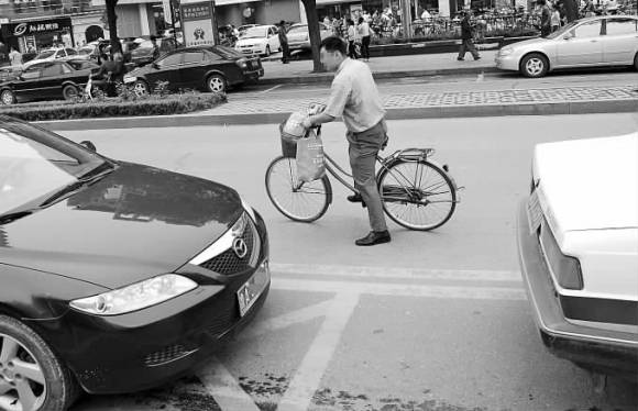 25日,一位市民骑自行车驶上东岳大街的机动车道,穿梭在过往车辆中,不仅妨碍公共交通秩序,也给自身安全带来隐患。