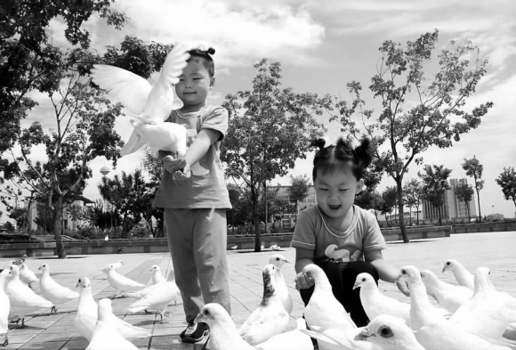 26日上午,4岁的双胞胎姐妹在市政广场给鸽子喂食。当日,持续已久的阴雨天终于放晴,天空中白云朵朵,气温回升至23℃左右,市民纷纷走出户外享受阳光。本报记者 陈琳 摄