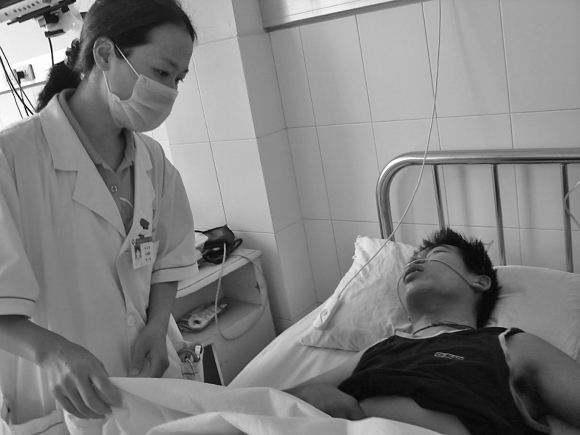 本报济南8月27日讯(记者 刘铭)人跳进液化气罐内无疑会立刻窒息,如不立刻离开甚至会失去生命。在济南,一名退伍军人、25岁的保安朱荣鑫为了救人就跳进了液化气罐中。27日上午,在济南市第三人民医院,朱荣鑫躺在病床上吸着氧气,向记者讲述了他救人的过程。