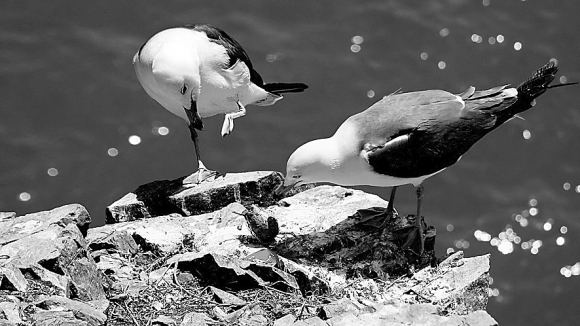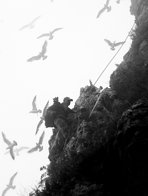 黑尾鸥通常把巢筑在陡峭的崖壁上,为了拍摄到真实的细节,摄影师们必须要靠近悬崖捕捉镜头。身下的悬崖被海浪包裹,于辉有点眼晕。她只好抱着摄像机,在地上用屁股一点一点地挪。为此,她磨破了好几条裤子。
