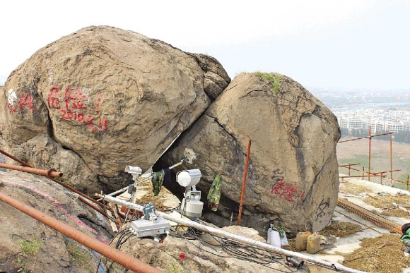 经过施工人员的加固、维护,药山上的“情侣石”滚落险情近日解除(大图),从27日早晨开始,在药山脚下的洋涓村,从外面避险多日的村民开始陆续回家(小图)。
