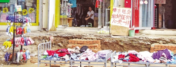 8月27日,山大南路正在修路,道路两旁的各大商店受到影响纷纷赔本大甩卖,以清仓为第一目标。