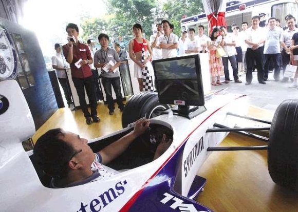 29日,在阳光百货门口,一乘客正在试驾FI赛车模型。当日,某名牌为推广自己的新产品,将与宝马索伯F1车队的1:1仿真模型搬到了现场,不少市民争相体验。