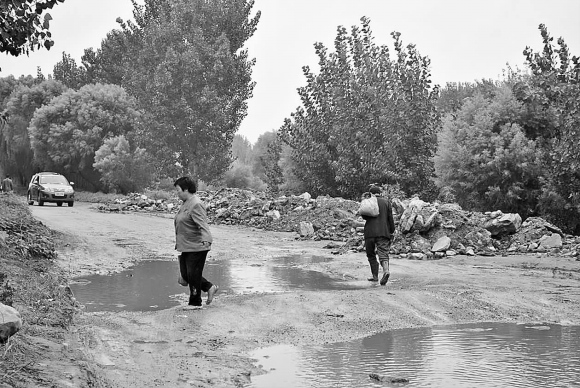 记者在现场看到,破损的道路在雨天成为了泥水坑,给附近居民