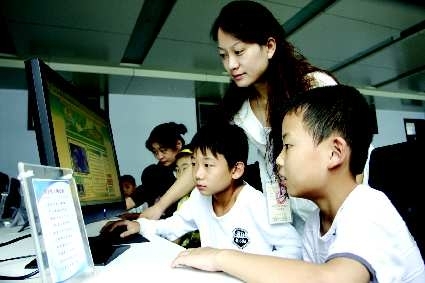 8月27日,南坊街道柳青苑社区电子阅览室,网吧监督员张元珍和未成年人一起浏览中央文明网未成年人网上家园的相关内容。暑假即将结束,为使未成年人不沉迷网络,南坊街道对30余名网吧和娱乐场所义务监督员进行培训并挂牌上岗,为未成年人健康成长营造良好的社会环境。