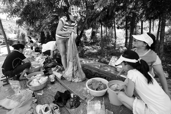 29日,在古陌隧道北,沿路边排水沟洗衣的市民形成数百米长龙,场景蔚为壮观。当天,威海终于结束了持续一周的降雨迎来了阳光,