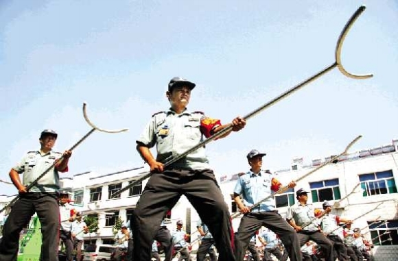 8月29日,德州市德城区保安大队150名队员,为了加强幼儿园和中小学的安保工作,顶着烈日进行钢叉十二式演练。