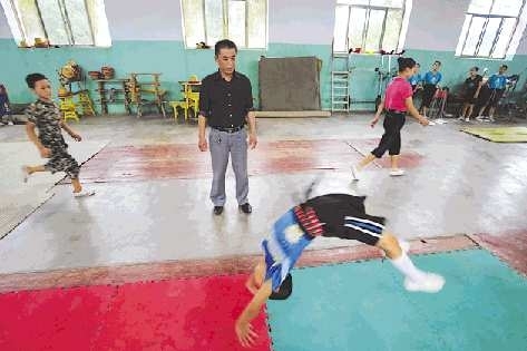 8月28日上午,在宁津县杂技艺术学校的练功房里,刘俊昌在指导学生们训练。