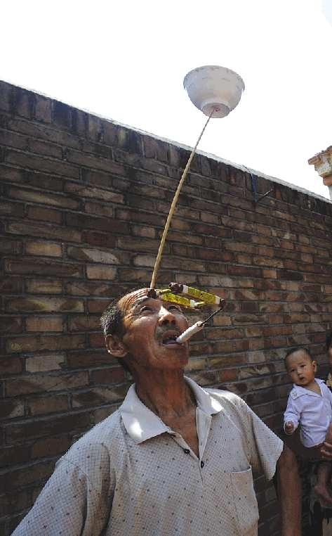 王金贵要表演传统的“十样杂耍”。他口中噙着刀柄,刀尖上立着一根竹签,竹签上端顶着碗底儿,小碗飞速旋转。他的头部时而前倾,时而退后,保持着平衡。围观的村民中有人惊叹:这老汉还有这手绝活!